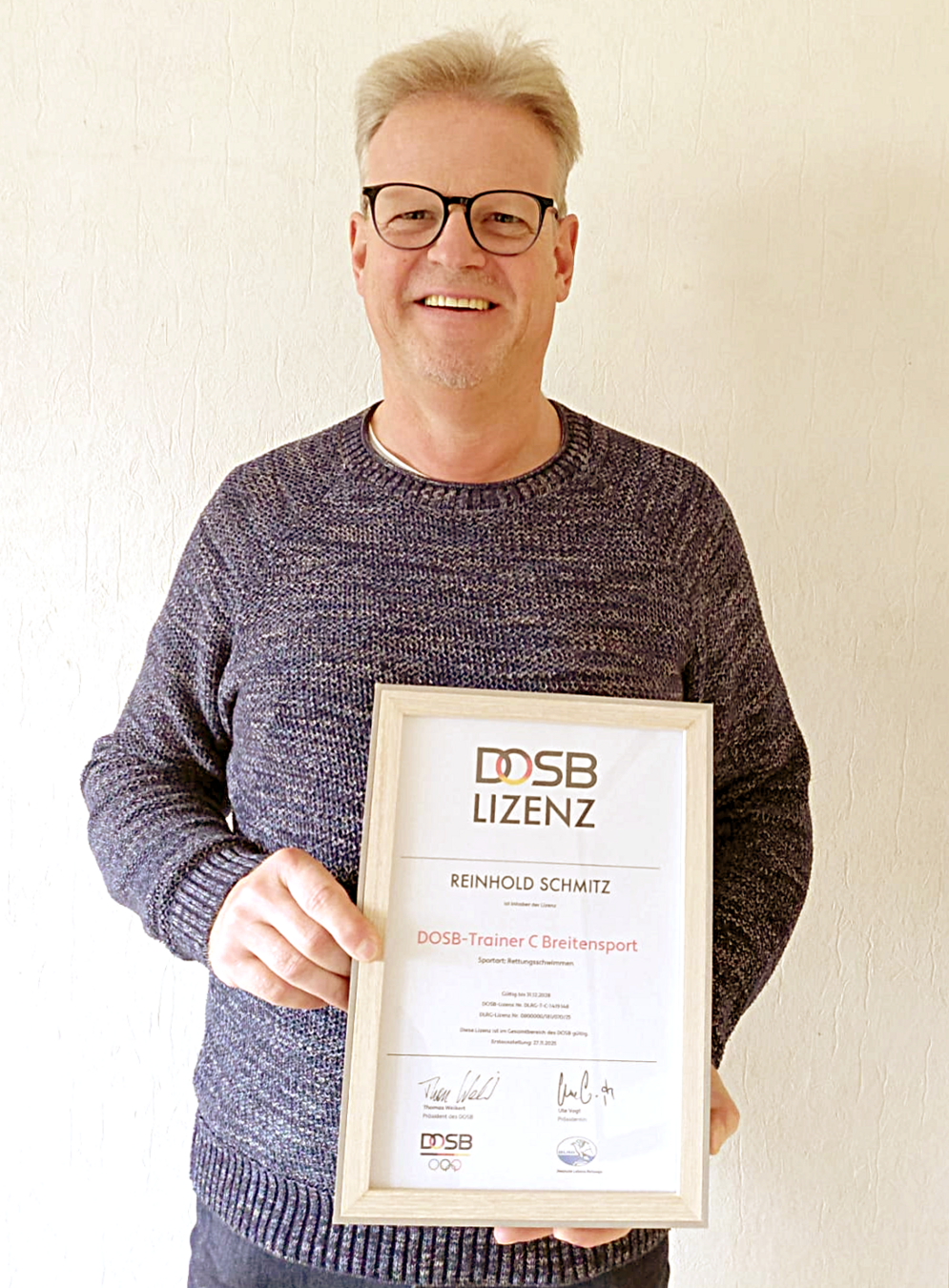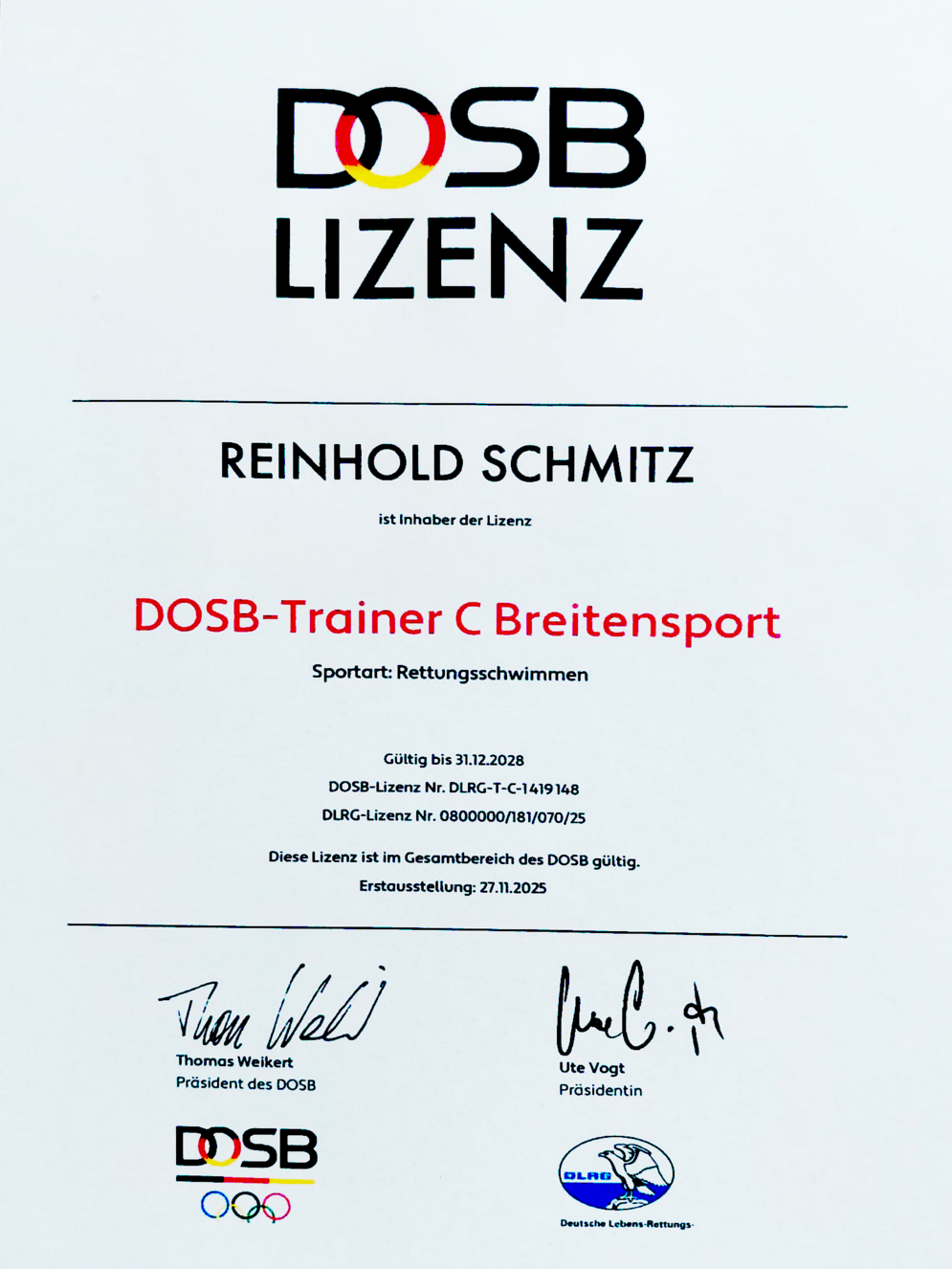 Am 27.11.2025 Reinhold Schmitz die Urkunde als DOSC-Trainer C Breitensport - Sportart Rettungsschwimmen. Damit haben wir im Verein eine weitere kompetente Kraft zur Unterstützung und Durchführung unserer Aubildungslehrgänge im Rettungsschwimmen Bronze, Silber und Gold.